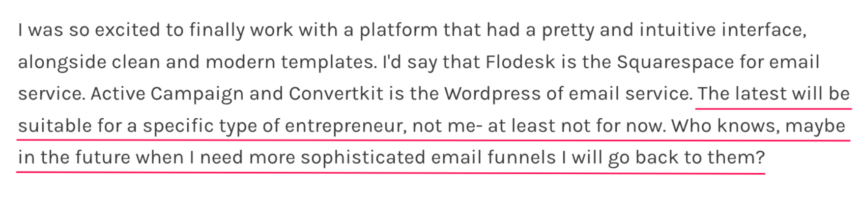 If you're just starting your business or running an established business but simply want to keep things minimal, I would recommend Flodesk wholeheartedly. I've used Flodesk for three years, loved using it, and I feel nostalgic about it. Support was stellar; I wrote a lot of emails and got compliments for my emails being elegant and soothing.