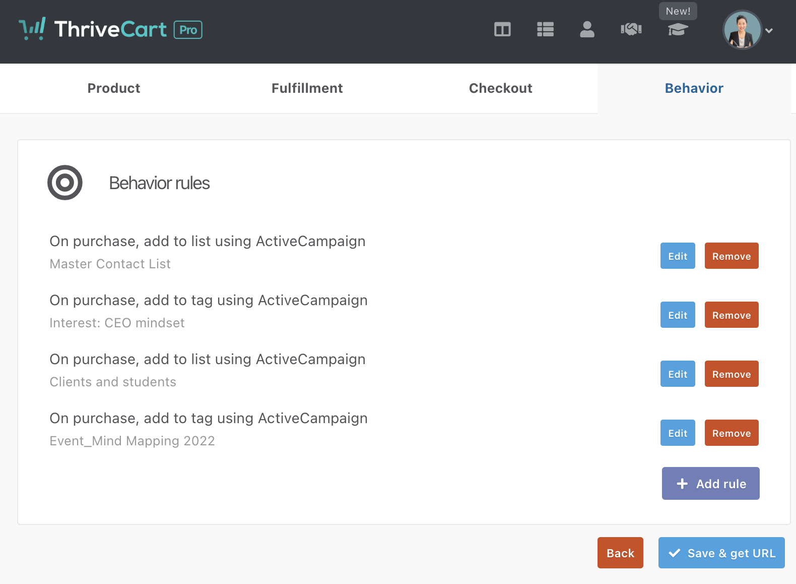 I set up a masterclass in Thrivecart and connected it directly to an email workflow inside Active Campaign so the students could receive their invitations and details for the event in their inboxes. This is where the magic happens inside Thrivecart; I can find my Active Campaign lists and tags: