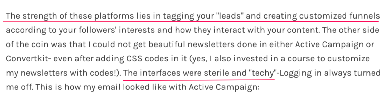 1) Active Campaign aligns with my goal of sharing simple emails with no design, distraction-free