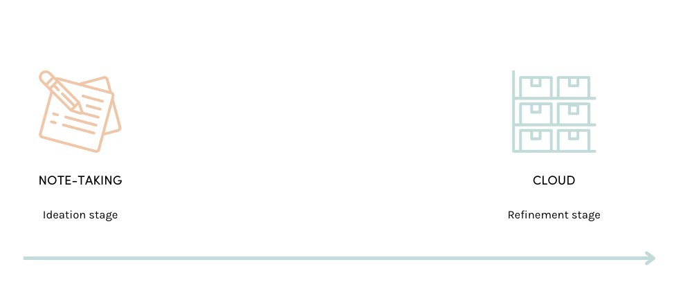 The functionality of Evernote allows me to create a fleeting note (voiced, typed, or scribbled) before I migrate it to a more structured and permanent stage in Google Drive. In Google Drive, I can also share the document for feedback or proofreading.