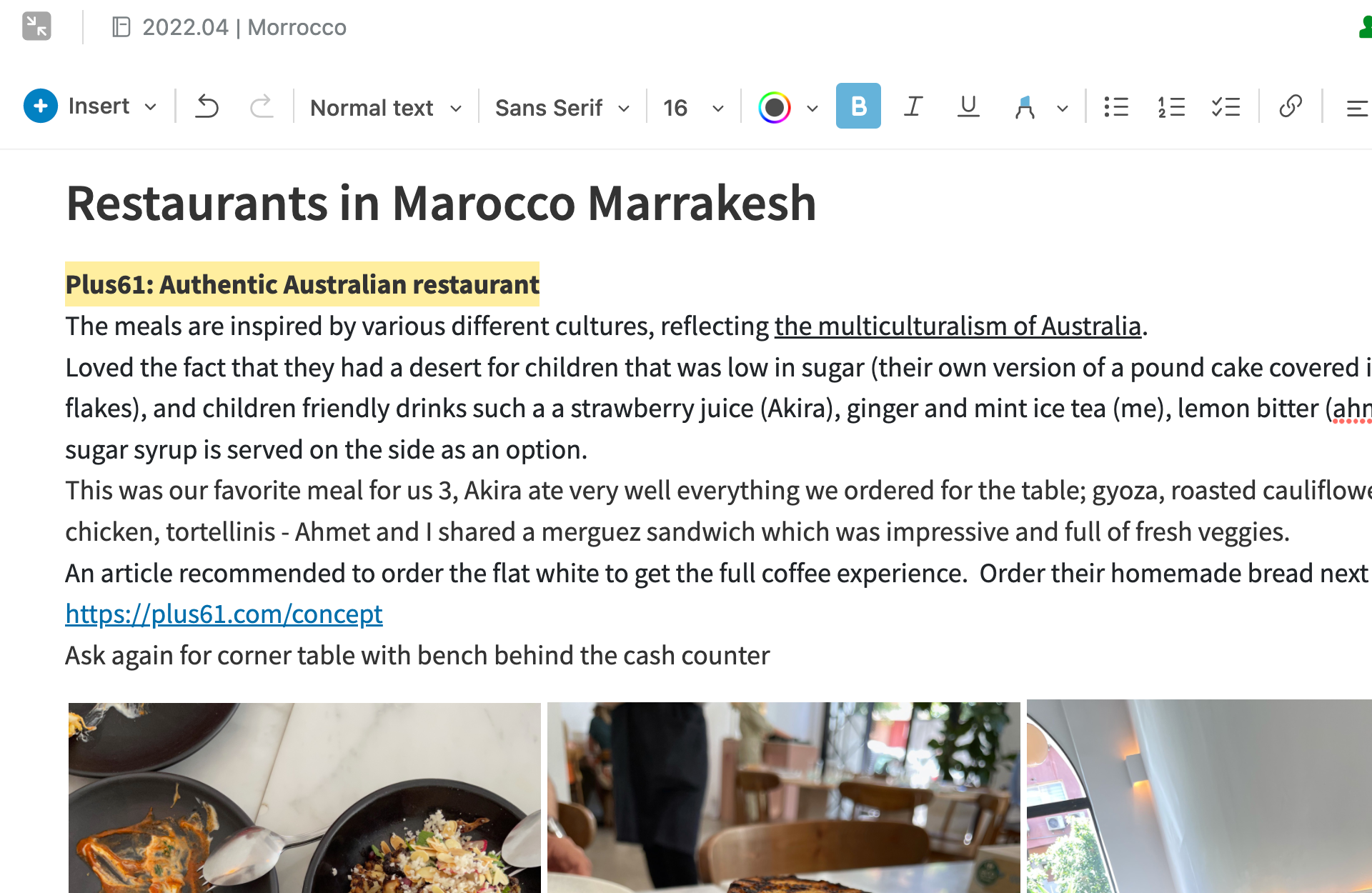 At the end of our trip, I like to create a summary of our favorite places with photos, and some notes for the next trip, such as whether it was child friendly, which seat was good, dishes we really liked, etc. Once the trip is over, I archive the notebook and will pull it out again when I go to the same destination or want to share the resources with someone else.