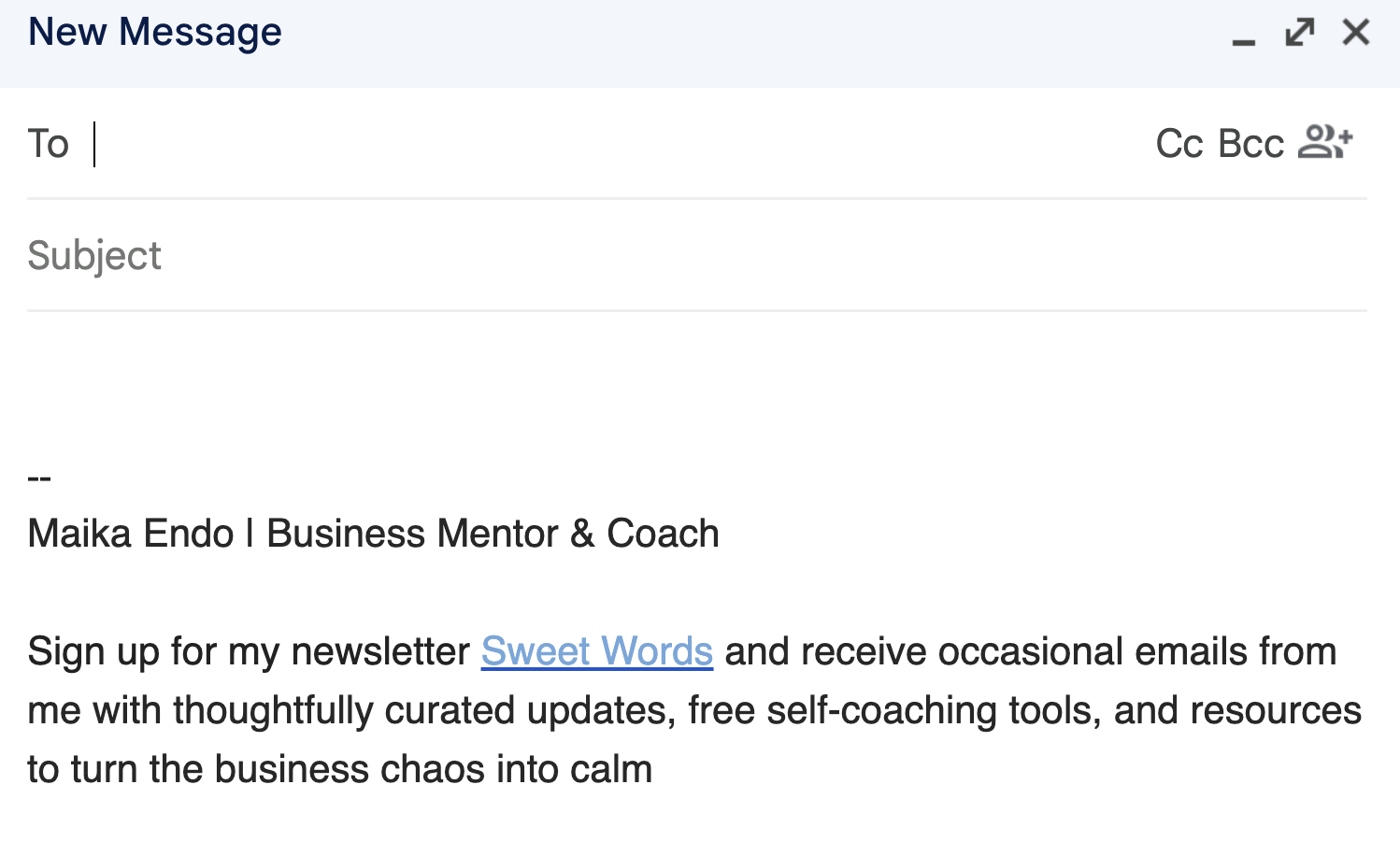 ➡ My email signature is basic and straightforward, but you can find fancier ones. Search in Canva using those keywords, or try Google; there are plenty of options! I’ve used HubSpot’s free email signature generator for a while, and it was easy to use.